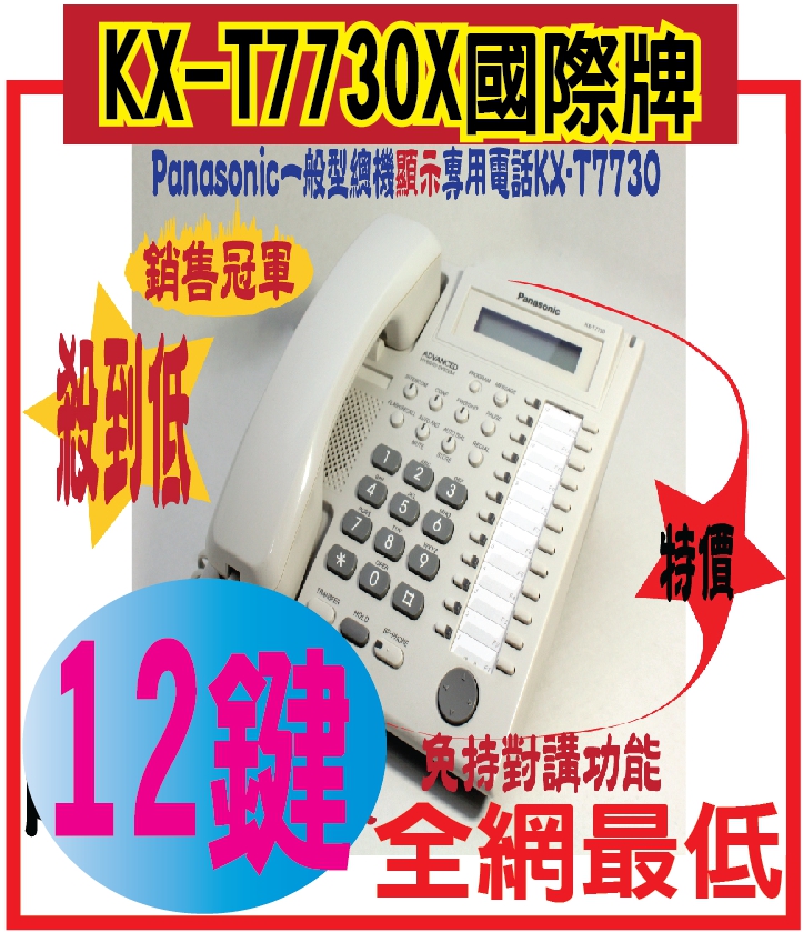 | KX-T7730X | 45717 | KX-T7730X國際牌12鍵顯示型功能話機Panasonic | | 2,999 | | 15621 | 現貨供應 |