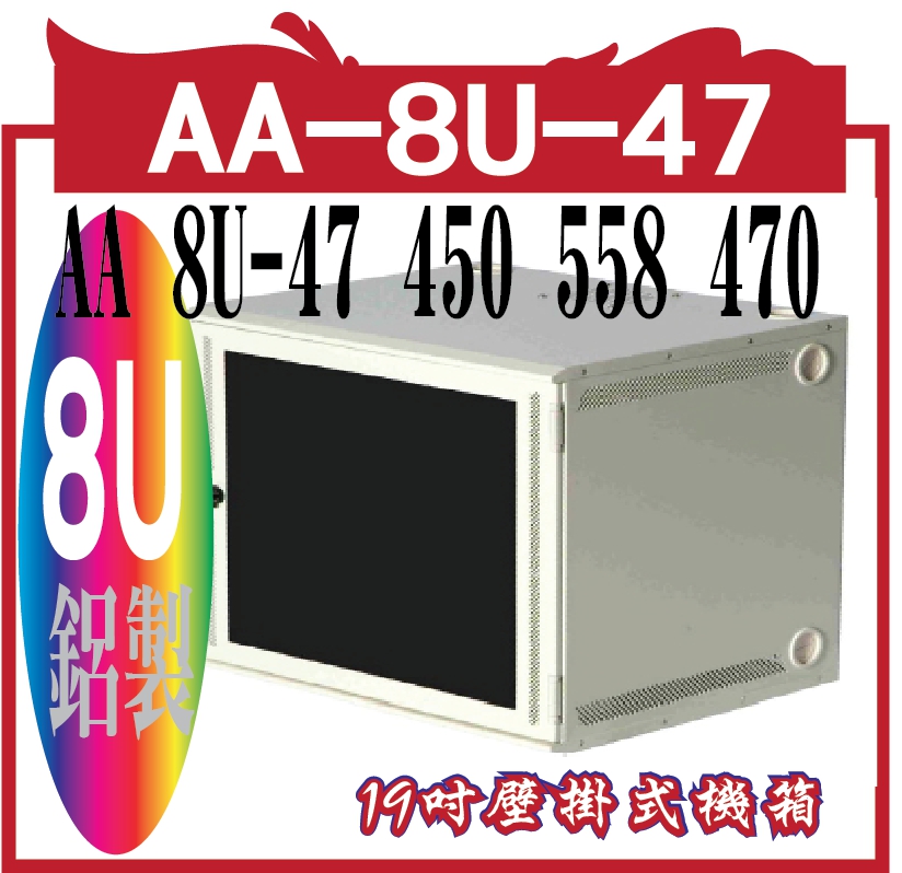| AA-8U-47 | 19055 | 19吋壁掛式機箱 AA-8U-47 前鋁框深色壓克力門 附隱藏式門鎖及鑰匙 | |  | 3731 | 1022家優良廠商出貨 |