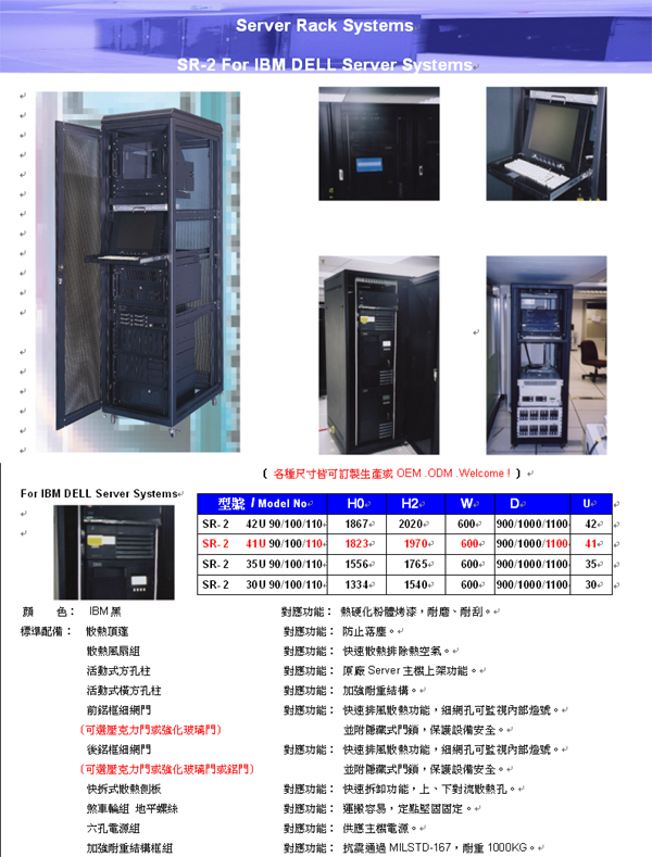 SR-2 伺服器專用機架系列,是依據 ANSI/EIA RS-310-C的標準,並通過UL認證及CE認證與工研院震動測試MIL-STD-167