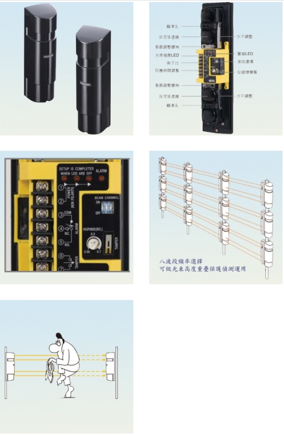 LED指示 電源指示:紅色LED (投光器) / 警報指示 :紅色LED(受光器) / 光束強度指示:三只紅色LED (受光器)