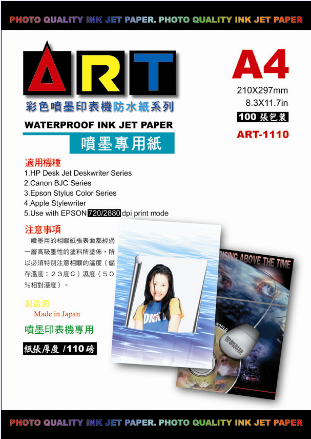 專案限量 (日系) ART 高彩高白度~噴墨防水紙 110 磅系列 ( 720~5760DPI ) ART-1110 防水噴墨專用紙 A4 / 110 磅 100張 / 包