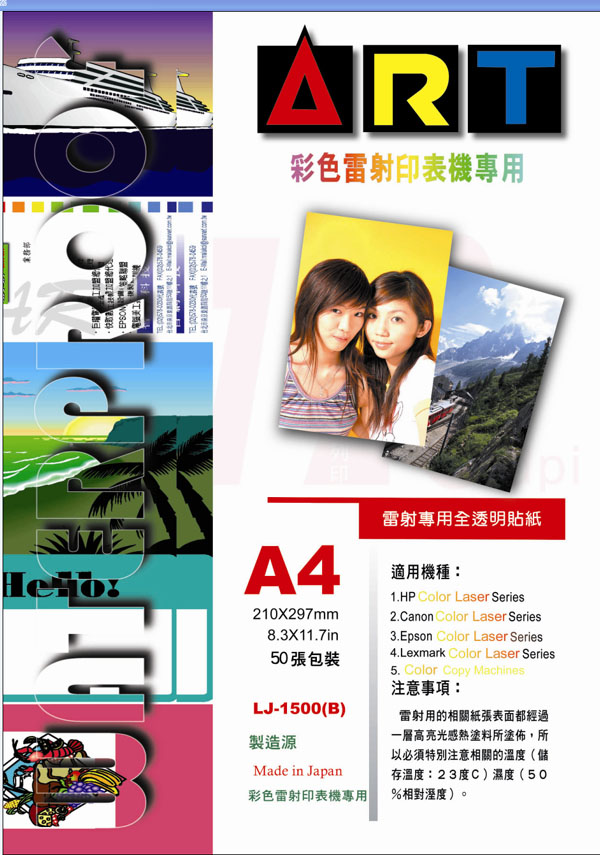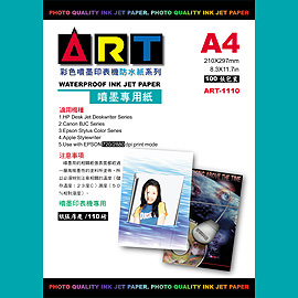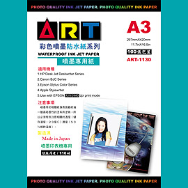 除外,ART防水噴墨名片紙採雙面化學塗布處理,所以可以雙面列印且同時防水,最適合用來作個人彩色名片、節慶賀卡的輸出。不單如此本公司還有噴墨專用投影片、防水噴墨自黏式貼紙、噴墨專用T恤轉印紙等各種的列印紙材,全系列從 4"x6"、A4、A4+、A3、A3+、A2、A1、A0 等各種尺寸大小一應俱全,應有盡有。各目前正廣受各大廣告公司、設計公司、印刷廠及各公家機關團體等等的各階層高階輸出者愛用,無論任何廠牌,只要是噴墨印表機,列印後就防水