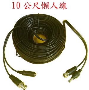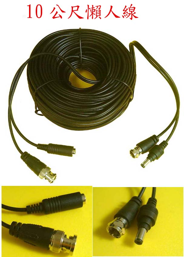10公尺懶人線 您是否常為了買了監視器後為配線而傷腦筋呢?現在起您可省去不必要的煩惱囉!館長大力推薦〝懶人線〞AV訊號線+電源線,台灣製造、操作簡易,長度有10公尺、20公尺、30公尺,可依個人所需選擇長度,訊號絕對不會LOST不論監控、施工或DIY在使用上都很方便,是監視器材最佳配備。