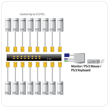 •可透過菊鏈式串聯,串接額外31台主機,以從單一控制端控管512台電腦。