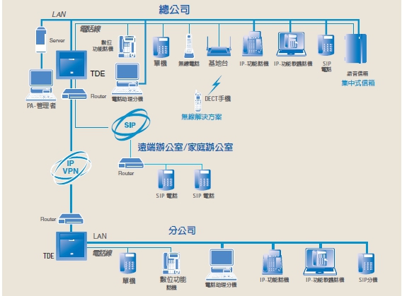 總公司與各分公司間可以利用VoIP架構IP通訊網路,讓總公司及各分公司之間使用現有數據專線即可到達遠端內線通話。