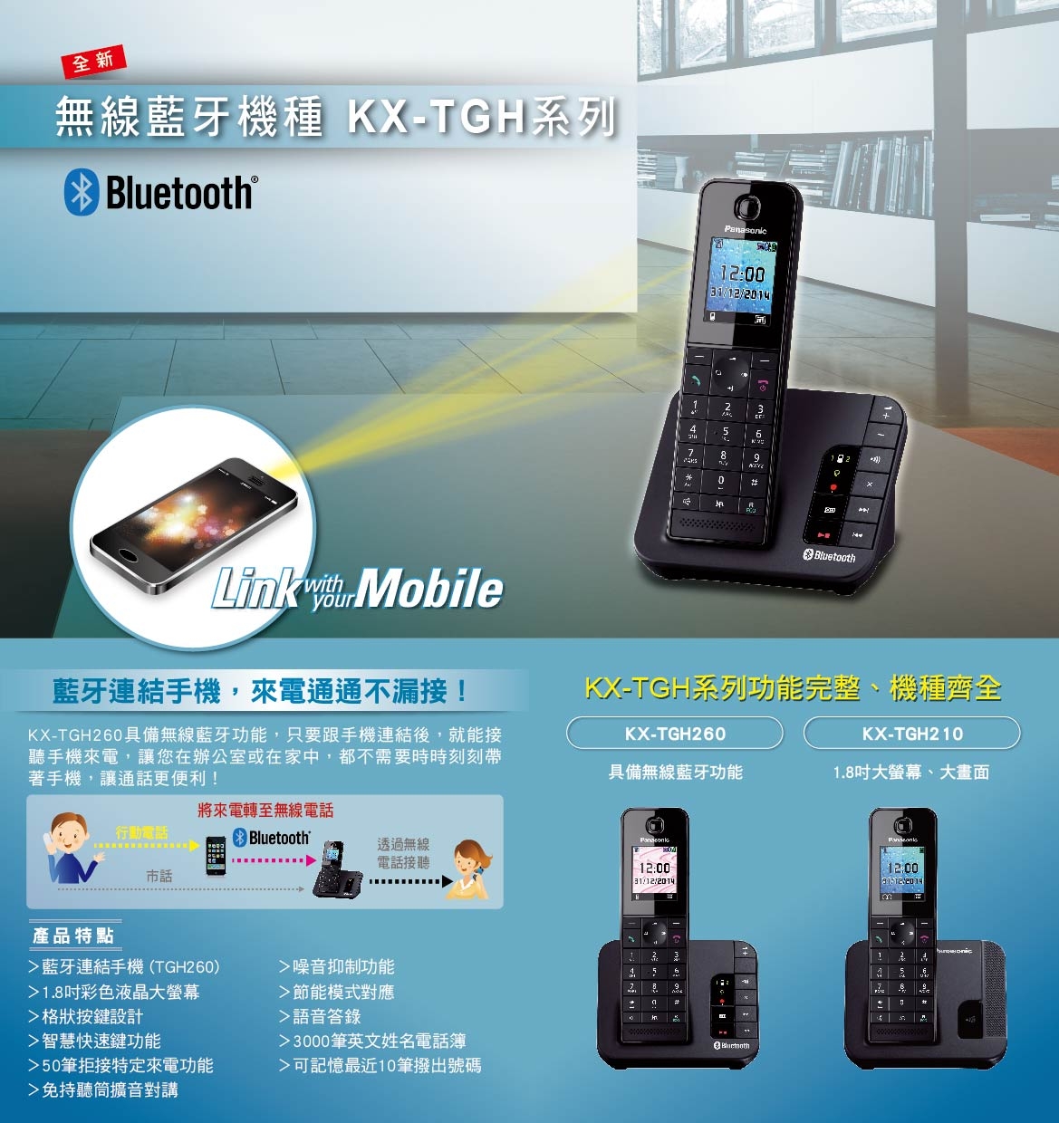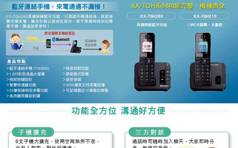 DECT 數位答錄大字鍵無線電話 KX-TGE210升級旗鑑款產品特色