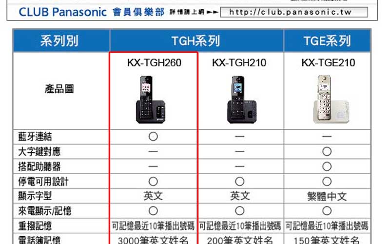 DECT數位式無線電話-->DECT 數位答錄大字鍵無線電話 TGH-260升級旗鑑款商品查詢代碼:QK60646
