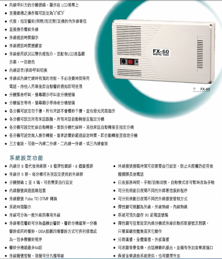 萬國總機系統FX-60)+4台DT-8850D(6A)顯示型話機顯示型話機萬國電器累積四十年通訊產品技術,研發團體自行研發高科技通訊產品,目前之通訊產品已整合有線、無線、數據及語音相關設備,突破僅企業使用的範疇,適用於任何場所,除穩定的通訊品質,更發揮通訊系統高效率的功能。
