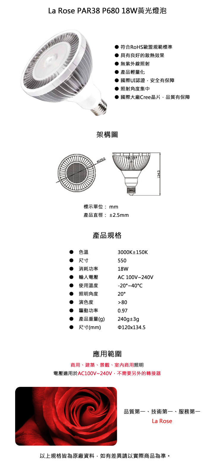 專案限量La Rose PAR38 P680 18W黃光燈泡符合RoHS歐盟規範標準 •具有良好的散熱效果 •國際UI認證,安全有保障 •無紫外線照射 •國際大廠Cree晶片 •照射角度集中