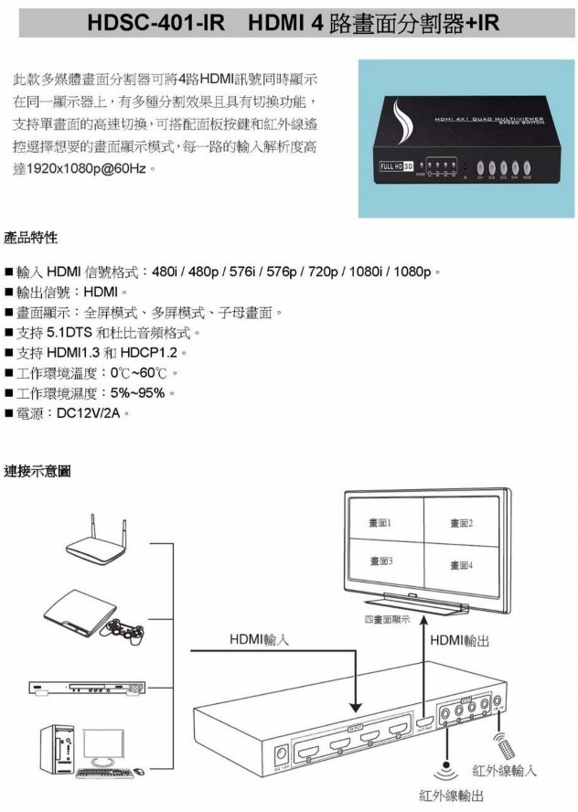 HDSC-401-IR HDMI 4路畫面分割器-IR-輸入HDMI信號格式:480i/480p/576i/576p/720p/1080i/1080p