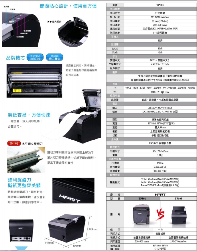 HPRT-TP805(Black)/ HPRT-TP805(White) ●特有水平雙切刀設計,獨家專利技術,解決困擾用戶的切刀磨損過快,切不平,切不斷之難題。