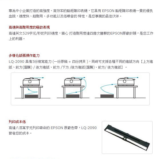 EPSON LQ-2090 點陣式印表機專為中小企業打造的高強度、高效率的點矩陣印表機,它具有 EPSON 點矩陣印表機一貫的優良血統,速度快、超耐用、多功能以及低噪音的 特性,是您事業的最佳伙伴。