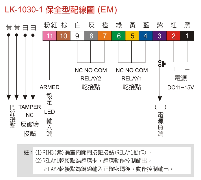 具反脅迫、開門逾時未關、強行進入、連續五次誤碼輸入等警報接點輸出。