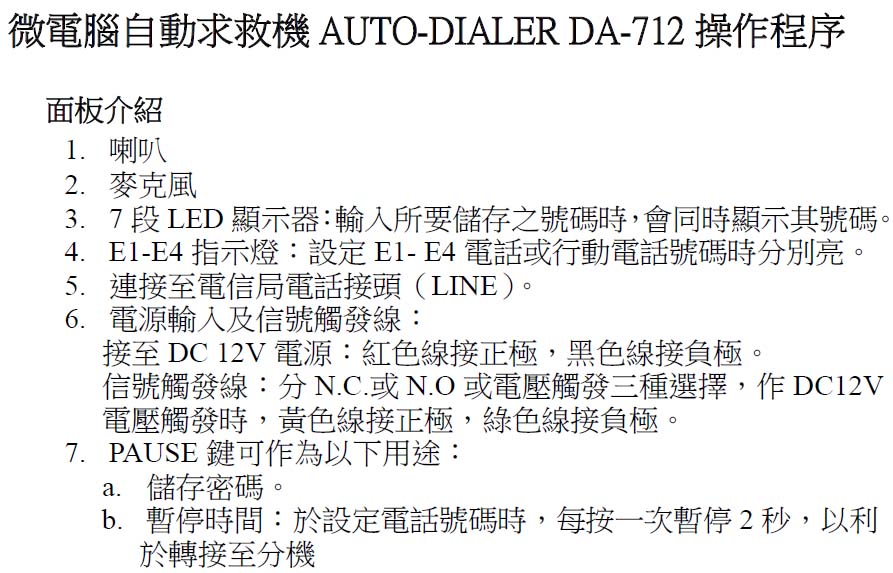 專案限量DA-712-K 警報自動撥號器 當有火災警報時就會啟動自動撥電話,也可搭配所有有線防盜系統接乾接點,或由電壓觸發自動撥電話報警,讓你居家安全在第一時間得到保障。