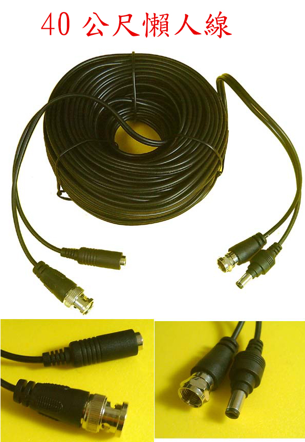 40公尺懶人線 您是否常為了買了監視器後為配線而傷腦筋呢?現在起您可省去不必要的煩惱囉!館長大力推薦〝懶人線〞AV訊號線+電源線,台灣製造、操作簡易,長度有10公尺、20公尺、30公尺,可依個人所需選擇長度,訊號絕對不會LOST不論監控、施工或DIY在使用上都很方便,是監視器材最佳配備。