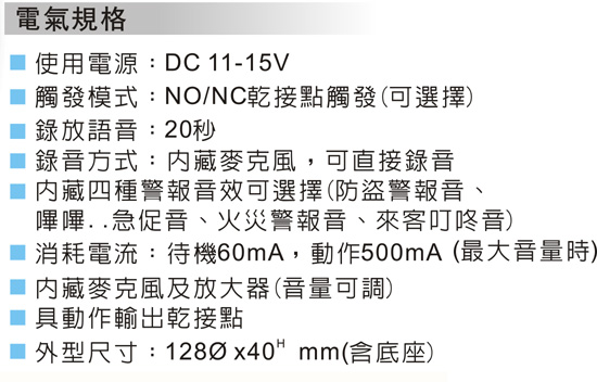 錄音方式:內藏麥克風,可直接錄音內藏四種警報音效可選擇 ( 防盜警報音、