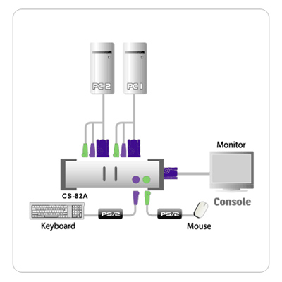 CS82A 為前後端內建PS/2介面的KVM切換器,提供一組控制端管控2台伺服器電腦主機,使用者可藉由前面板上切換按鍵,或是透過鍵盤上的熱鍵組合選擇切換。這是單一控制端管理多電腦,最簡便的解決方案。堅固耐用及體積小的外型設計為其重要特色。