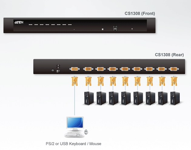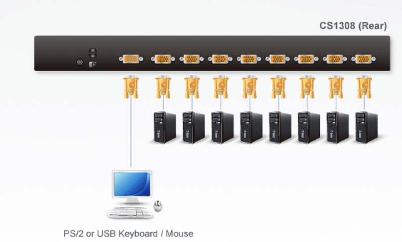 CS1308 KVM多電腦切換器具備高擴充能力,其可採用堆疊方式*另外串接8台KVM多電腦切換器,並透過一組控制端(鍵盤、螢幕及滑鼠)管理多達64台電腦。CS1308在控制端及電腦端皆支援USB及PS/2雙介面。