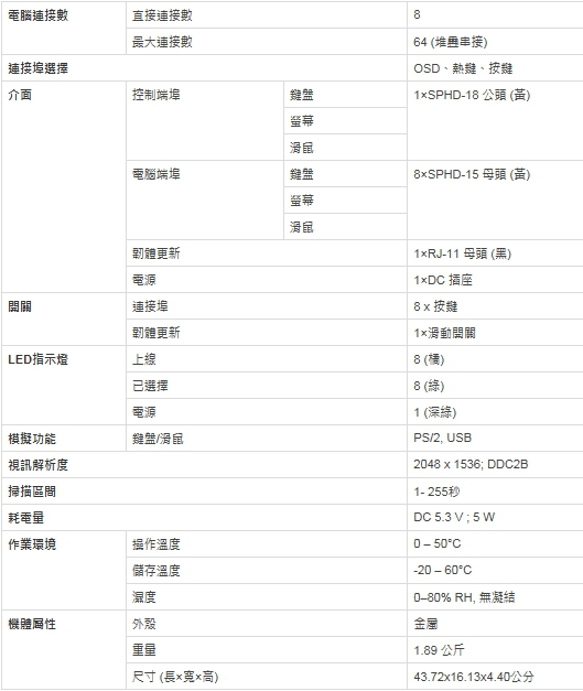 詳規 8埠PS/2 - USB KVM多電腦切換器