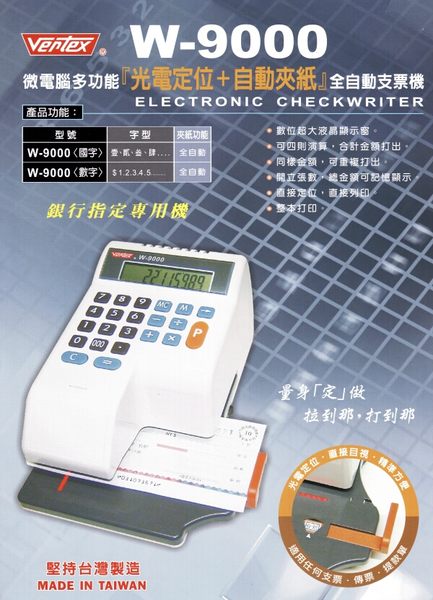 專案限量支票機 VERTEX W-9000光電定位+自動夾紙自動支票機