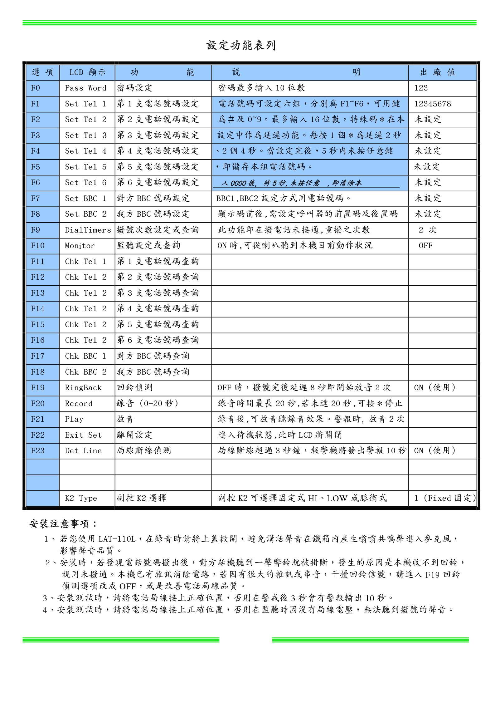 LAT-110 記憶六組電話號碼和一組BB CALL及顯示碼,亦可連接總機型單機埠使用,內置EEPROM 不受停電因素影響,免用電池能永久記憶語音內容、電話號碼及各項設定,本機具有自動搶線及優先通報功能