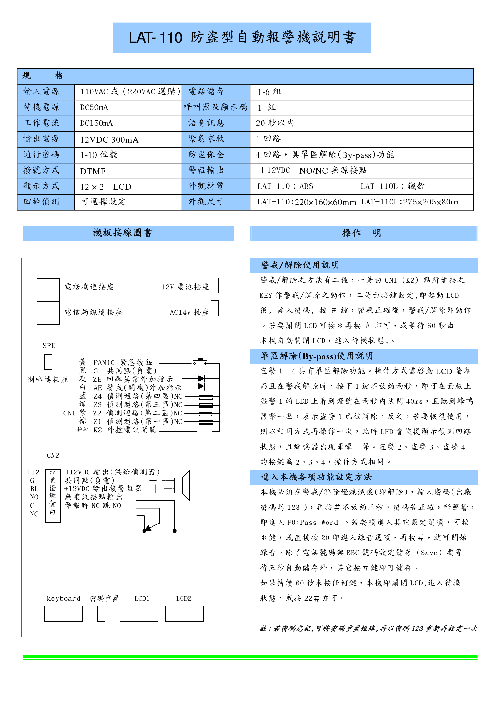 LAT-110 保全型電話自動報警機,採用高科技中央處理器及精緻而細密的軟體程式結構設計而成,具高穩定性、高抗雜訊及自動偵測功能,智慧型的LCD字幕導引操作流程,最具人性化的保全系統設備。