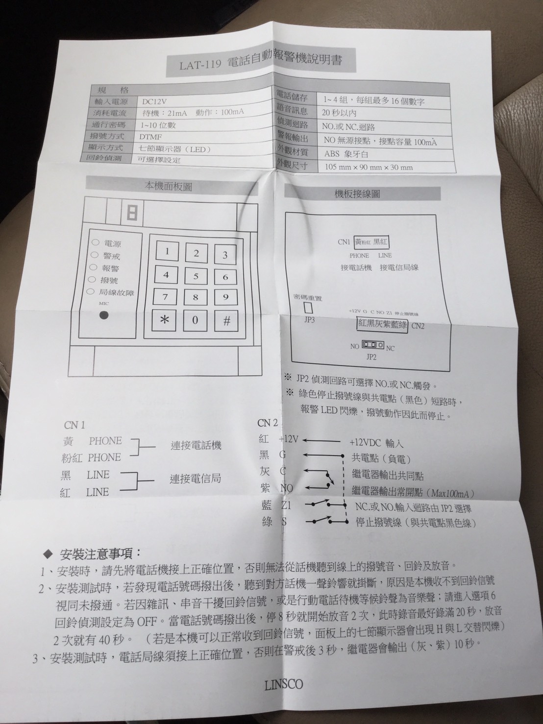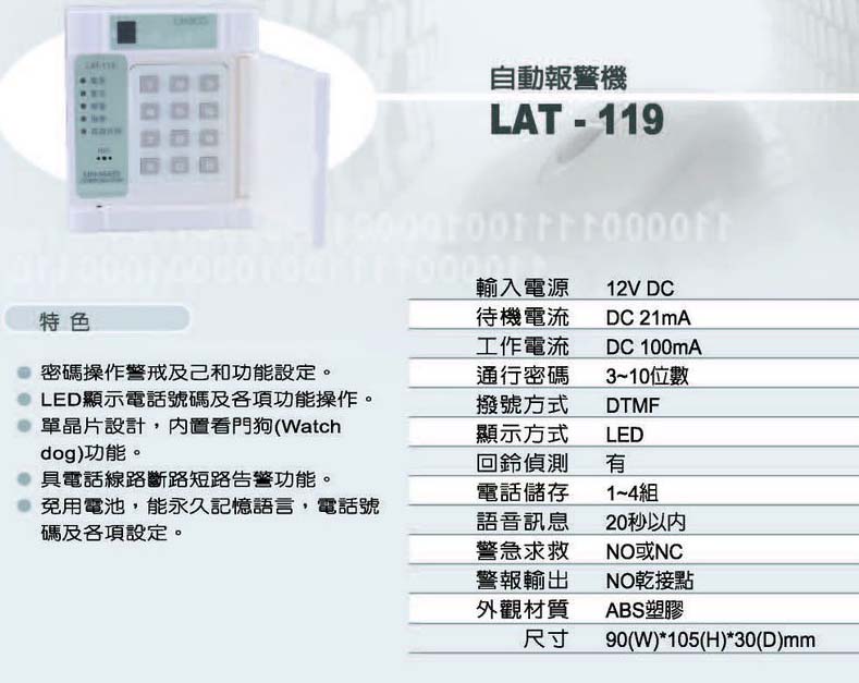LAT-119產品規格︰ ◆輸入電流:12VDC