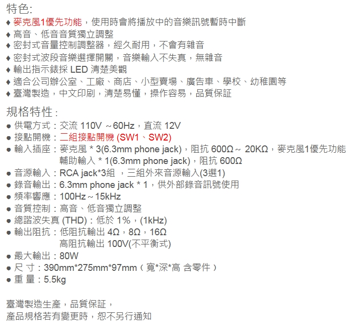 ● 輸入插座:麥克風*3(6.3mm phone jack),阻抗 600Ω∼ 20KΩ,麥克風1優先功能