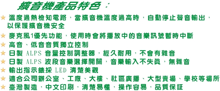 ● 溫度過熱檢知電器,當擴音機溫度過高時,自動停止聲音輸出,以保護擴音機安全。
