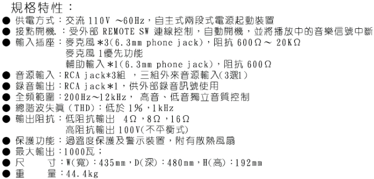 ● 輸入插座:麥克風*3(6.3mm phone jack),阻抗 600Ω∼ 20KΩ