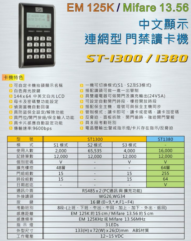 門組管制: 15組 (設定後可儲存於卡機內,並可離線使用) (S1.S3模式)