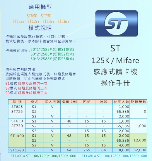| 專案限量ST-625MF 單機型門禁讀卡機 單機型門禁卡機(可切換S1.S2模式操作) | ||||||||||||