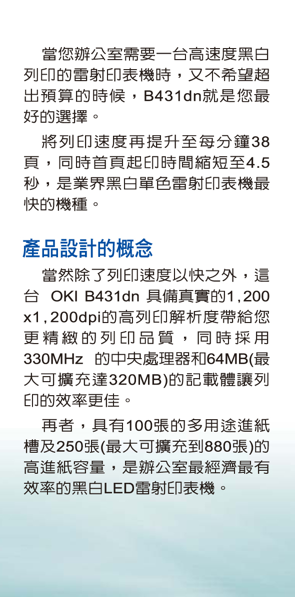 當然除了列印速度之外,這台OKI B431dn具備真實的1,200 x 1,200 dpi的高列印解析度帶給您更精緻的列印品質,同時採用330MH的中央處理器和64MB(最大可擴充達320MB)的記載體讓列印的效率更佳。