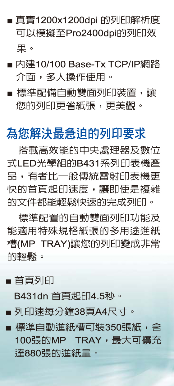內建網路與雙面列印的超高速黑白LED印表機當您辦公室需要一台高速度黑白列印的雷射印表機時,又不希望超出預算的時候,B431dn就是您最好的選擇。 當列印速度再提升至每分鐘38頁,同時首頁起印時間縮短至4.5秒,是業界黑白單色雷射印表機最快的機種。