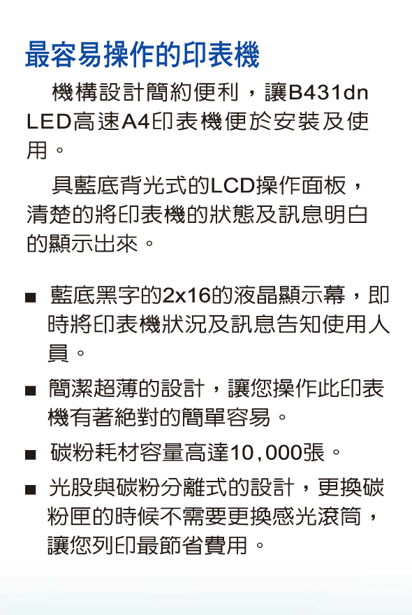 機構設計儉約便利,讓B431dn LED高速A4印表機便於安裝及使用。 具藍底背光式的LCD操作面板,清楚的將印表機的狀態及訊息明白的顯示出來。
