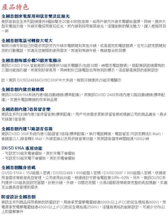東訊DX/SD360F電話總機系統每部分機提供20組來電顯示(包括日期、時間及電話號碼),同時對於已接電話也有特別的標示