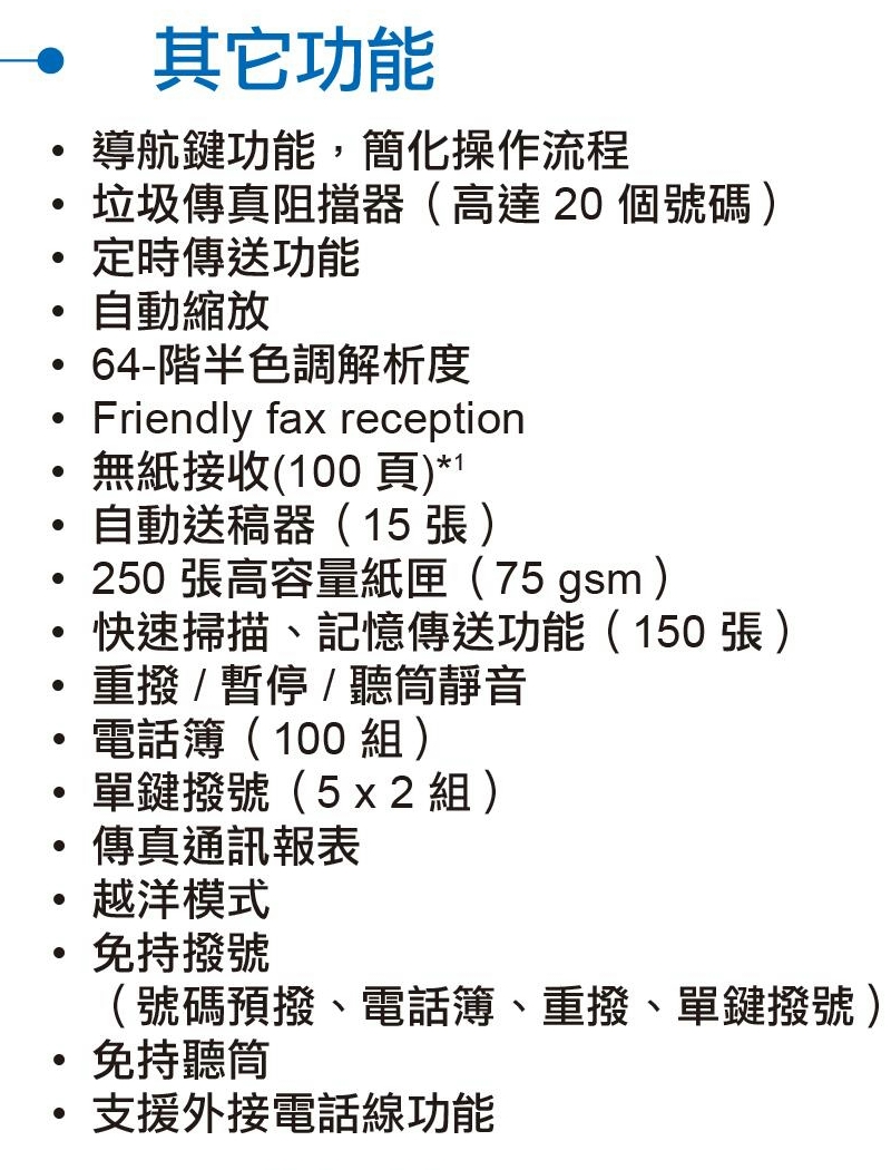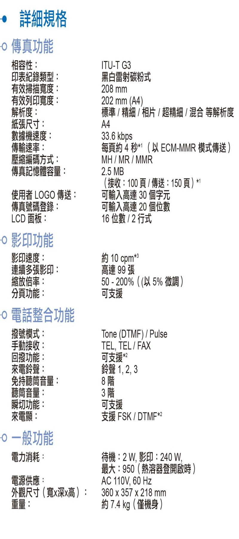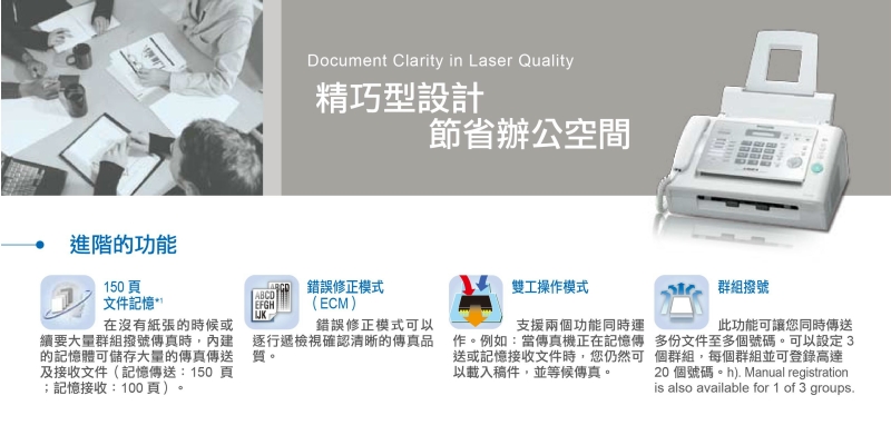 SUPER G3傳真速率:透過33.6kbps Super G3 高速傳真,約可減少1/2的傳輸通訊成本。