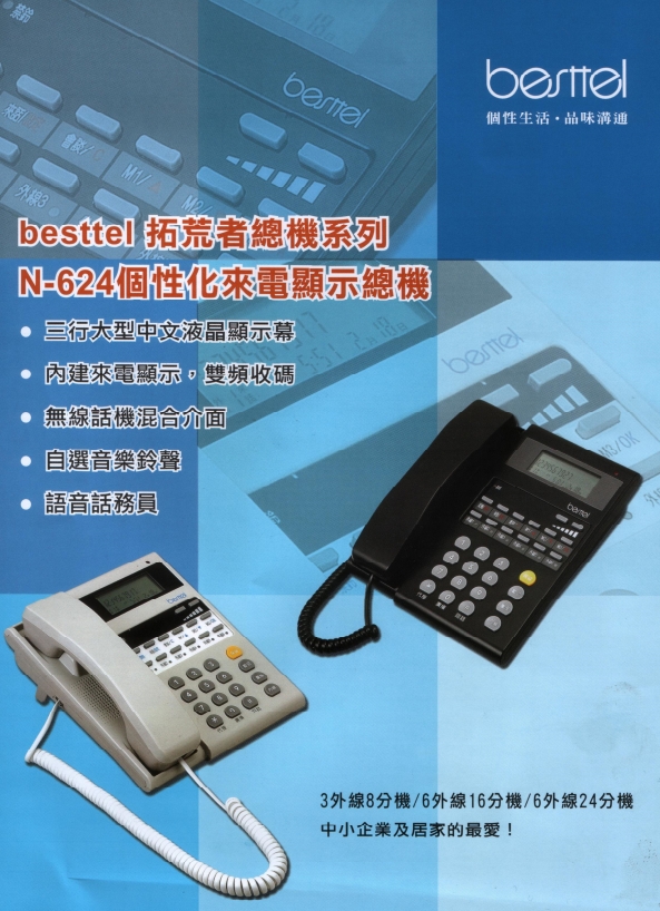 Besttel 拓荒者總機擁有30年的歷史,是台灣最為知名之品牌總機,並以品質卓越及價錢合理在台灣及國外市場著稱;現在更搭配 Besttel 倍仕特 Skype 網路電話盒成為Skype網路總機TAT-108 Besttel 拓荒者 Skype 總機,非常適合中小家庭、中小型企業、網路重度使用者、愛哈啦的年輕朋友以及打電話常被罵的電話族(電話費太高)。