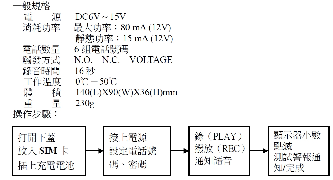 電話接起求救機的放音就不會在撥這一通電話 ,簡訊傳送成功就只一次.一般規格電 源 DC6V ~ 15V消耗功率 最大功率:80 mA (12V)靜態功率:15 mA (12V)電話數量 6組電話號碼,4組語音功能、2組簡訊。觸發方式 N.O. N.C. VOLTAGE