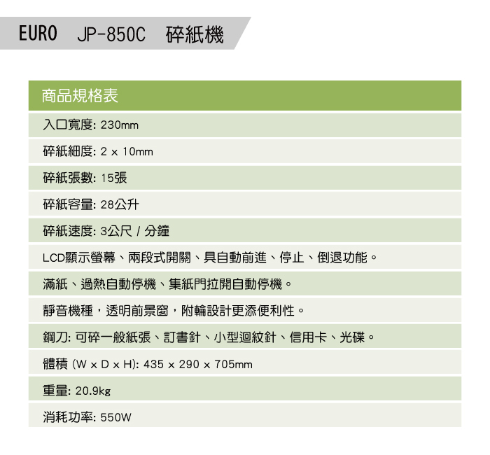 EURO碎紙機-->EURO 碎紙機 JP-850C商品查詢代碼:QK54859