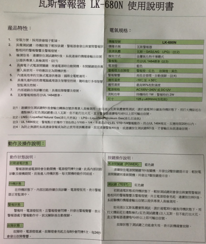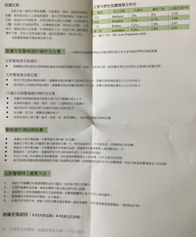 警報設定範圍 : 1/10~1/4 L.E.L. (瓦斯氣爆低限) 符合UL1484規定