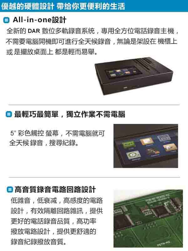 特點:DAR8000LS/LH錄音系統為5吋彩色觸控式螢幕,全中文操作介面,可輕鬆在螢幕上直接點選操作功能,可遠端網路監控。