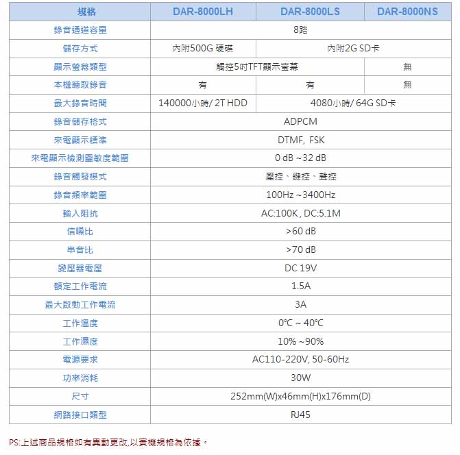 儲存方式:DAR8000LH(HDD); DAR8000LS/NS(SD卡)