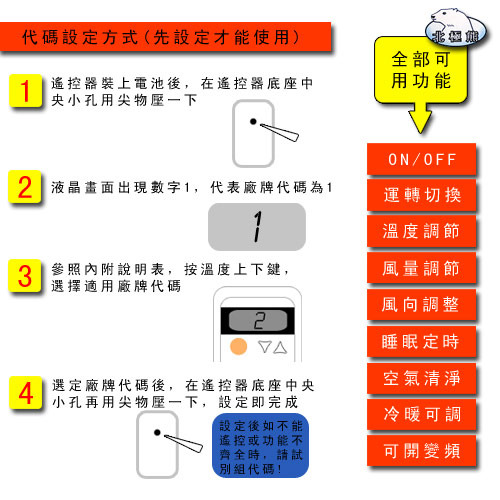 (1)代碼設定後,若僅能做電源開關及部分功能操作(例:溫度調整、定時、風量 等),而無法操作其他功能按鍵時,請再試試其他組代碼,找到最適用。