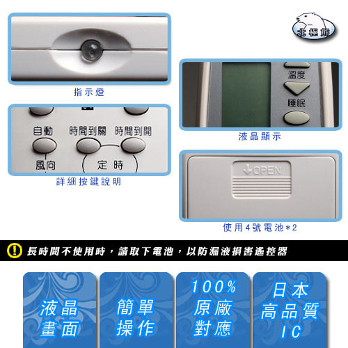 (2)本遙控器為整合萬用型,若按下部分按鍵無動作或液晶螢幕無顯示畫面,表示您的冷氣機無此功能,本遙控器並無損壞,仍正常現象。 |