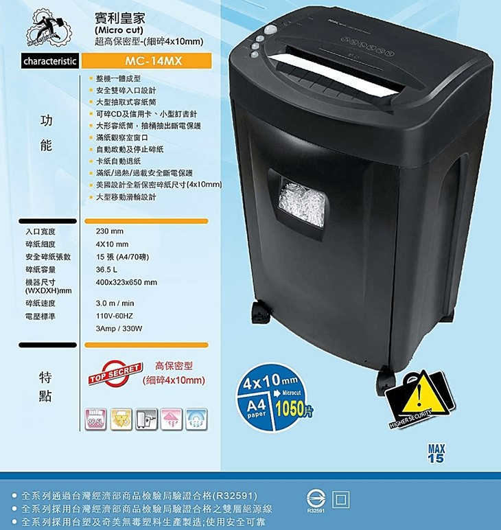 ,如缺貨,買家已先付款後需退款,跨行退款手續費將由退款給買家金額中扣除##ROYAL碎紙機MC-14MX細碎型