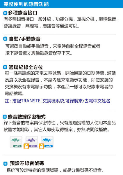 紀錄每一條電話線的來電去電號碼,開始通話的日期時間,通話長度以及全程錄音,本身內建來電顯示功能,即使安裝的交換機沒有來電顯示功能,本產品一樣可以記錄來電者的電話號碼。