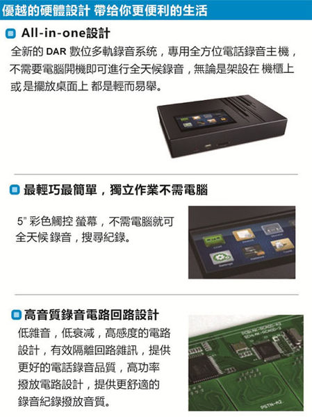 全新的DAR4000數位多軌錄音系統,專用全方位電話錄音機, 採用SD記憶卡,不需要電腦開機即可進行全天候錄音,掛壁設計無論是架設在牆上或是擺放桌面上都是輕而易舉。