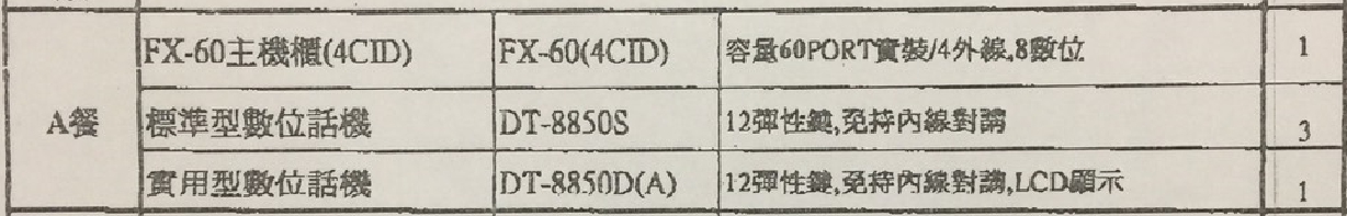 FX-60-->A餐萬國總機系統FX-60(4CID)+1台DT-8850D(A)12鍵顯示型話機 +3台DT-8850S12鍵標準型話機商品查詢代碼:QK62403