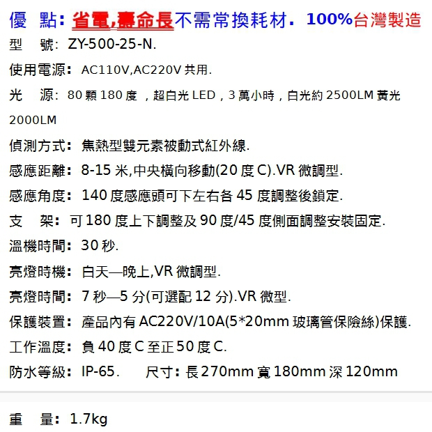 專案限量ZY-500-25-N 自動感應燈LED白光自動感應燈(25W)